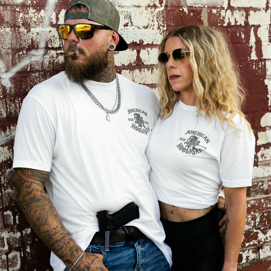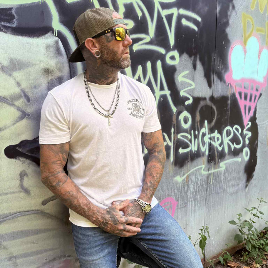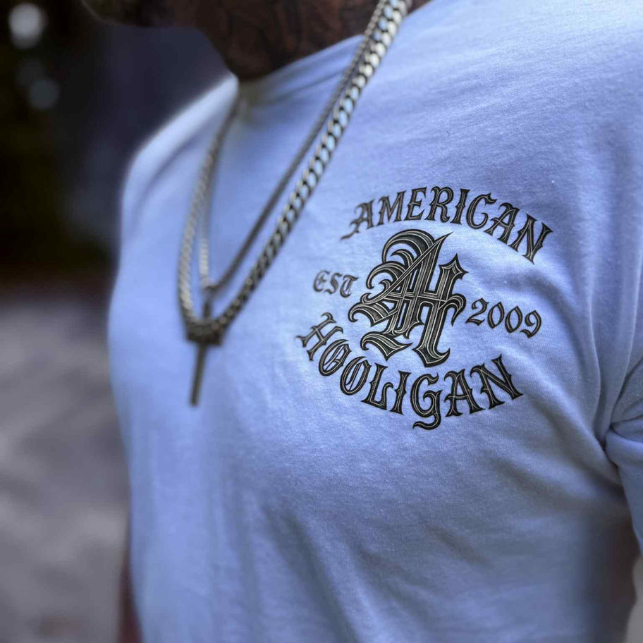 The Classic AH Tee keeps it timeless with a bold statement that never fades. Featuring the iconic AH emblem framed by American Hooligan and EST. 2009, this design pays tribute to the roots of the brand while carrying forward its unapologetic edge. A staple piece for anyone repping loyalty, grit, and style.